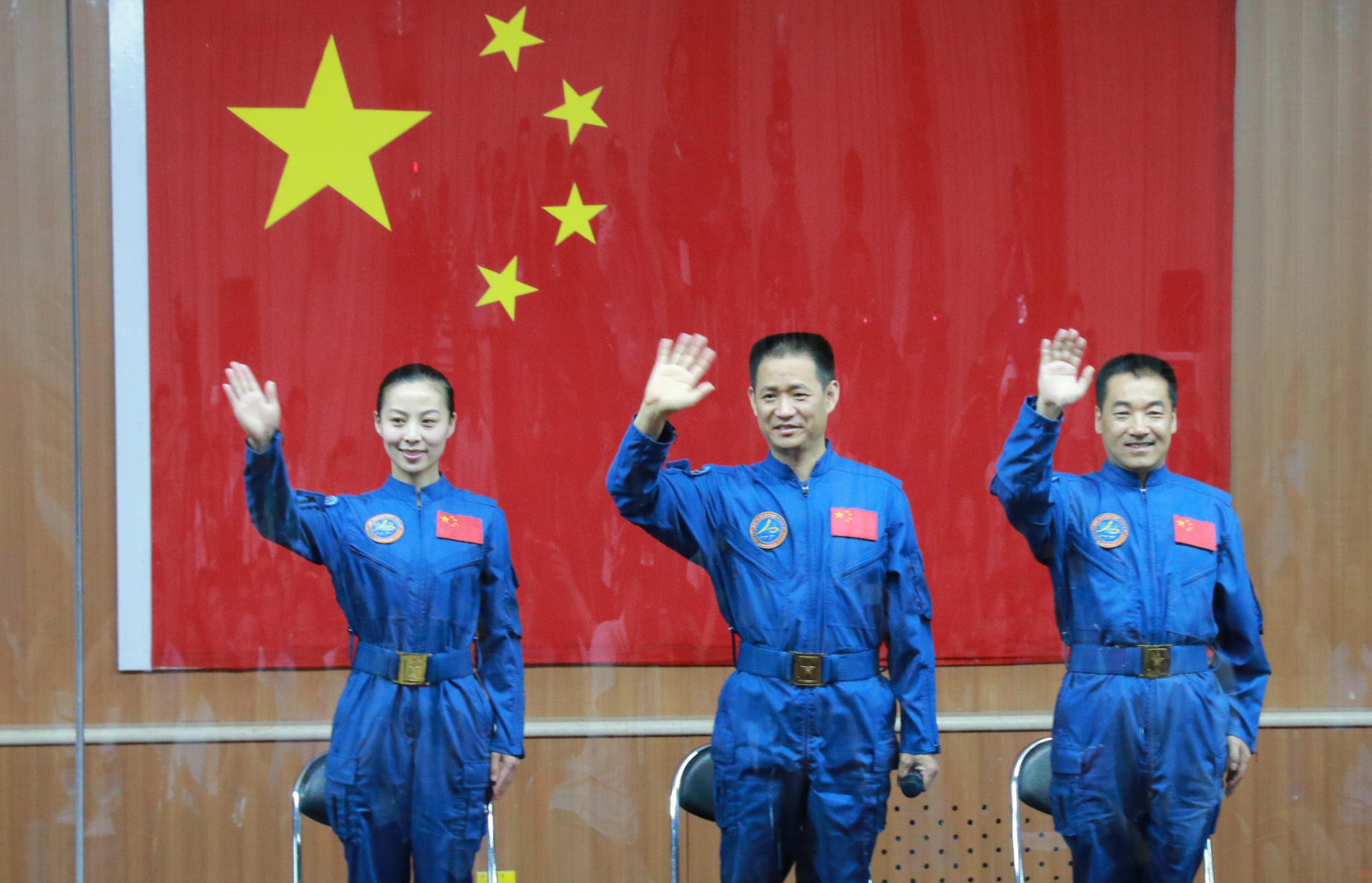2013年6月10日,天宮一號與神舟十號載人飛行任務航天員在酒泉衛星發射中心同記者見面。新華社記者 李剛 攝