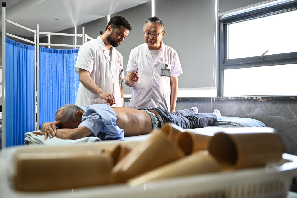 南京中醫藥大學2023級針灸推拿專業的碩士研究生阿米爾中來自塔吉克斯坦首都杜尚別。中學時,他愛上了中國文化,給自己取了個中文名字“李小龍”。長期學習中文的他,后來多次來到中國,并與中醫結緣。2015年,李小龍來到北京中醫藥大學學習針灸推拿,畢業后回到杜尚別,開設了一家中醫診所。2023年,李小龍又來到南京中醫藥大學攻讀碩士研究生,精進醫術。這是2025年4月18日,在南京中醫藥大學第二附屬醫院針灸康復科,李小龍(后左)在導師張建斌指導下給患者行針。