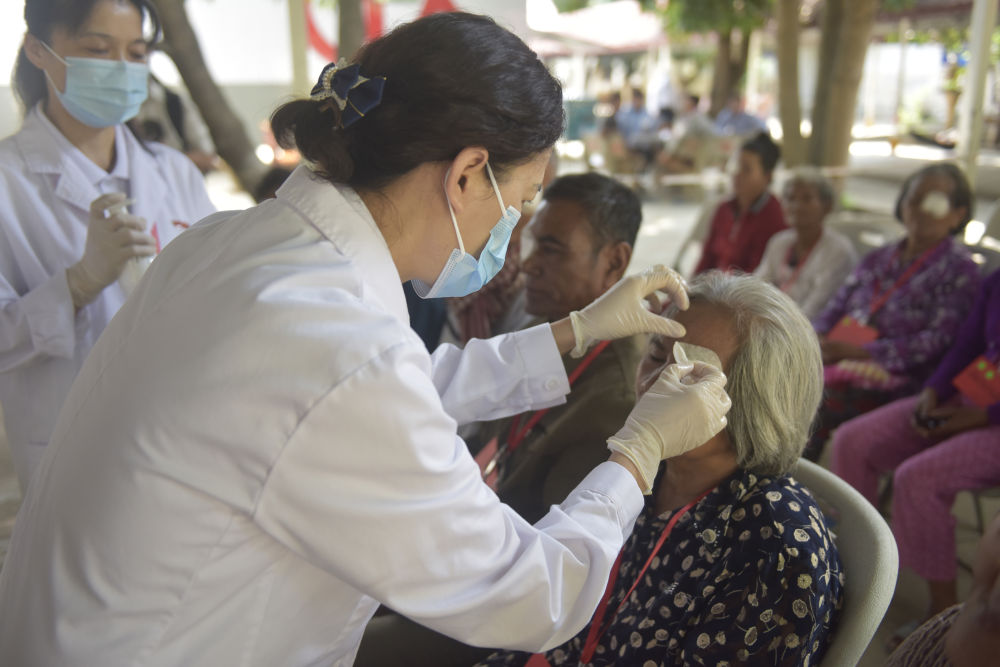 2022年12月,由中國廣西醫療團隊和中國香港非政府組織共享基金會合作開展的消除白內障致盲項目,在柬埔寨波蘿勉省啟動。該項目計劃用五年時間,在包括柬埔寨在內的五個國家為3.75萬名患者進行免費白內障手術。這是2024年1月28日,中國醫生在波蘿勉省醫院為接受手術的白內障患者摘掉紗布。