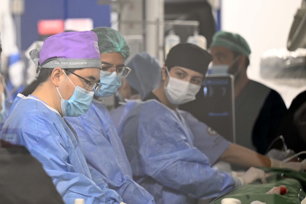 2025年1月23日,在巴基斯坦旁遮普省拉瓦爾品第市,中國醫學科學院阜外醫院副院長潘湘斌(左一)為一名巴基斯坦先心病兒童做手術。在兩天的時間里,潘湘斌率領的援巴先天性心臟病治療緊急項目專家組,為8名先天性心臟病患兒進行了免費手術。在巴期間,團隊還為當地約200名醫務人員開展了集中培訓。