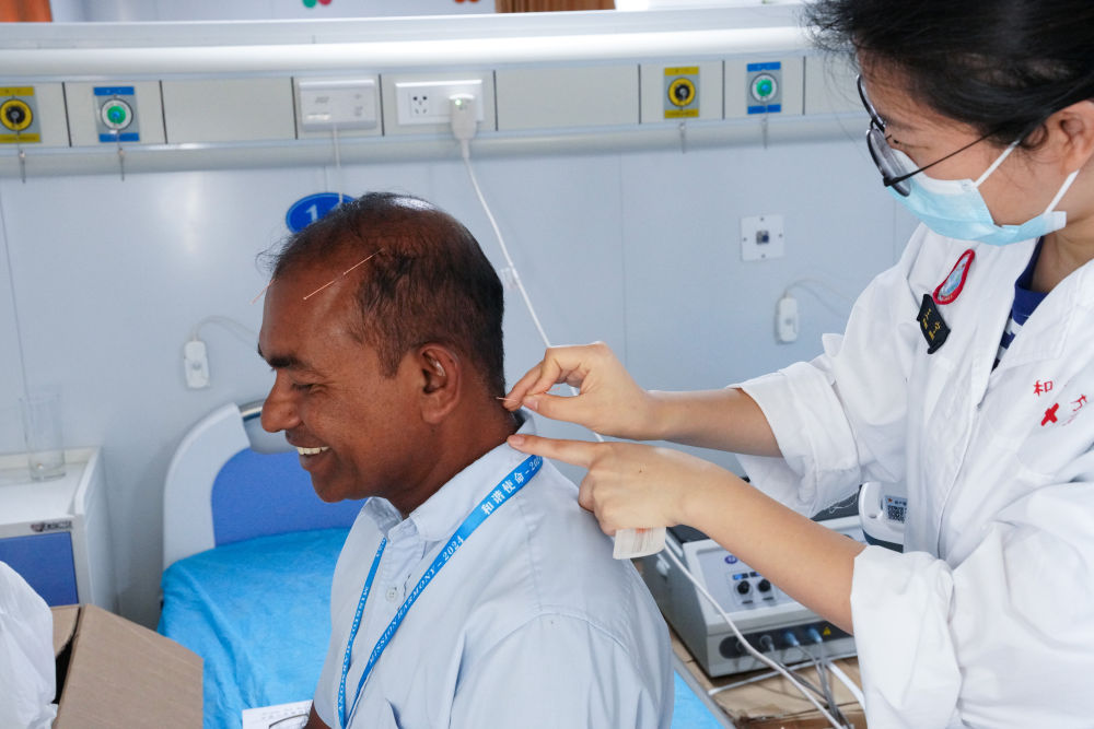 2024年12月24日,在斯里蘭卡科倫坡港,中國海軍“和平方舟”號醫院船上的醫生為當地居民做針灸治療。2024年12月,執行“和諧使命-2024”任務的中國海軍“和平方舟”號醫院船停靠在科倫坡港。船上17個臨床科室、5個輔助診療科室的100余名醫護人員,可開展60余種檢查治療或手術。許多斯里蘭卡民眾不遠千里而來,獲得中國醫生的診療救助。