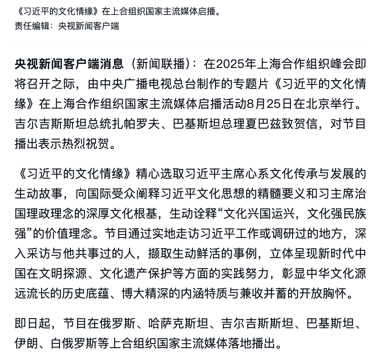 《習近平的文化情緣》在上合組織國家主流媒體啟播