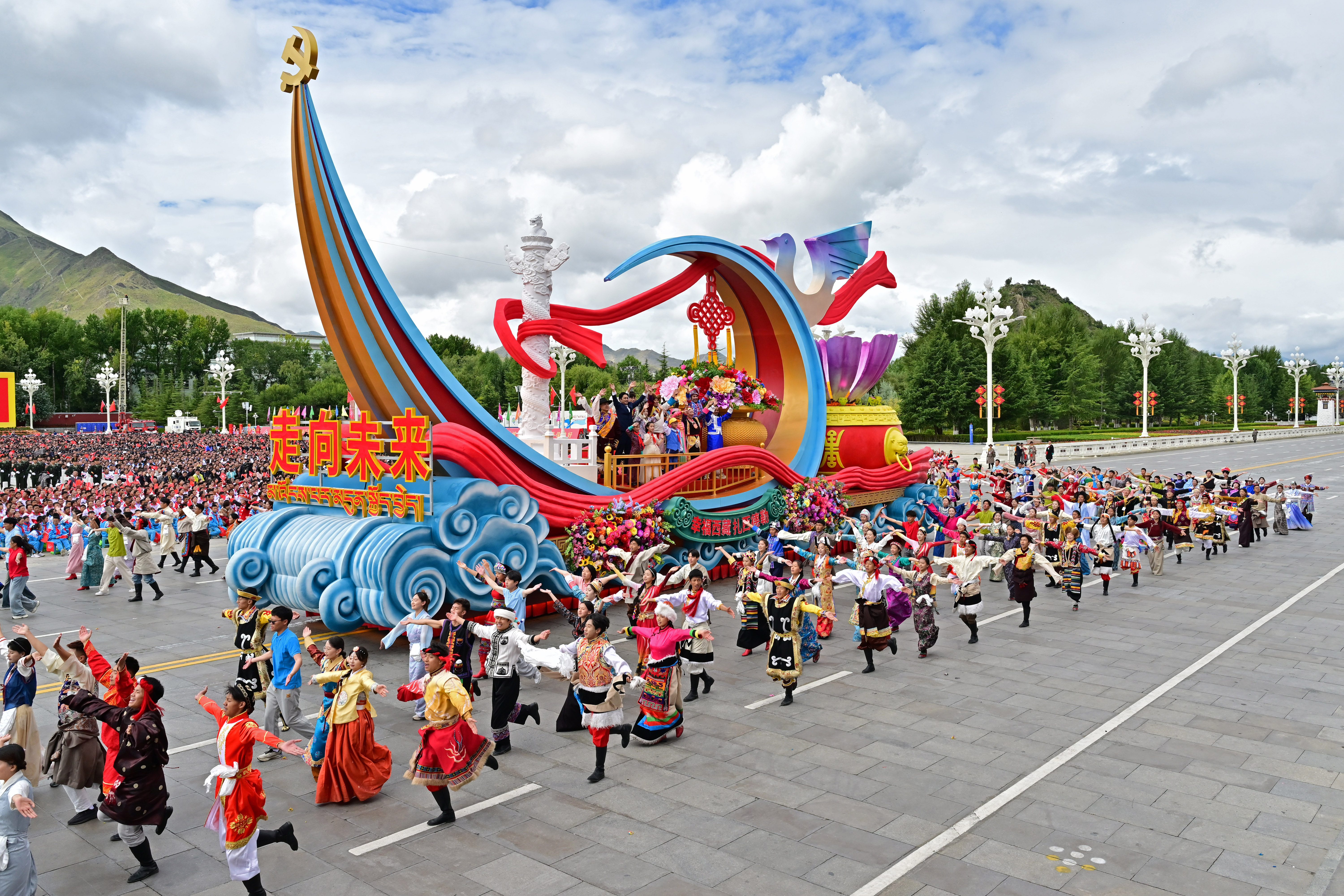 △8月21日上午,西藏各族各界干部群眾約2萬人歡聚拉薩市布達(dá)拉宮廣場,熱烈慶祝西藏自治區(qū)成立60周年。這是游行的彩車通過布達(dá)拉宮廣場。