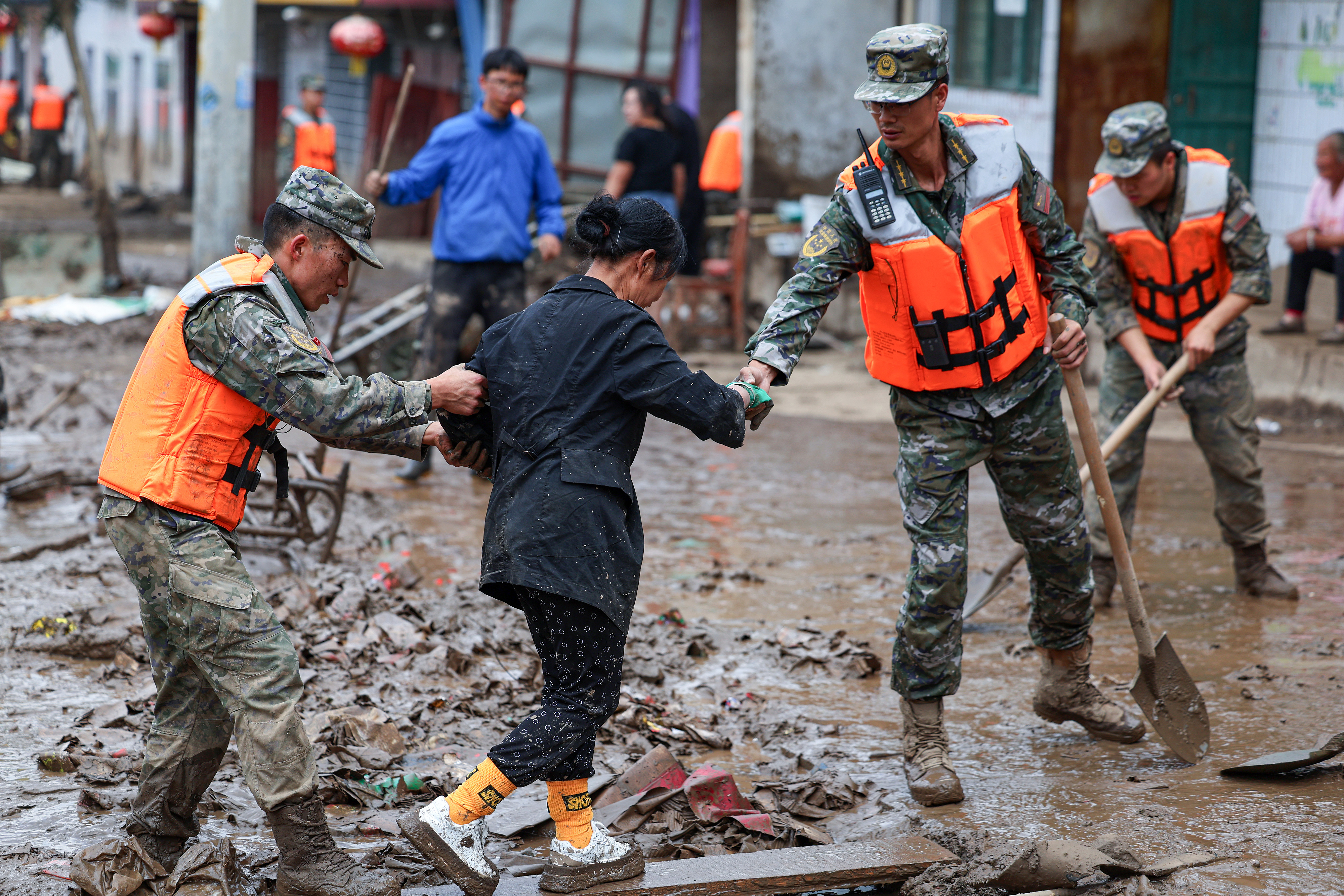 △2025年8月9日,武警甘肅總隊(duì)機(jī)動支隊(duì)官兵在蘭州市榆中縣城關(guān)鎮(zhèn)興隆山村幫助受災(zāi)群眾通過淤泥區(qū)。
