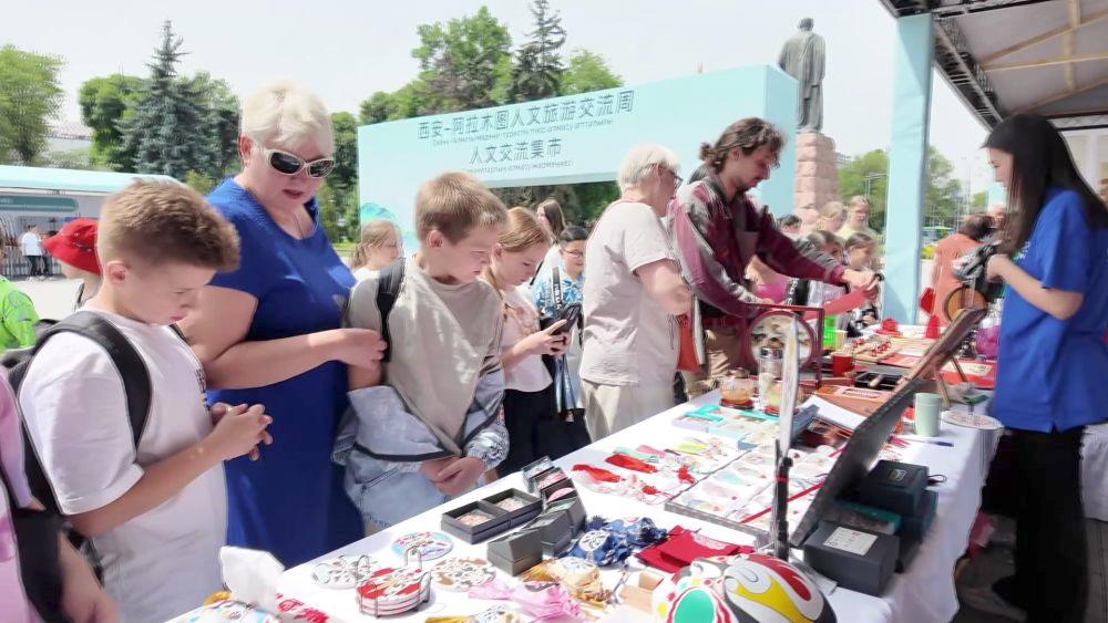 △2025年6月2日,人文交流集市在哈薩克斯坦阿拉木圖市中心的廣場拉開帷幕,非遺技藝、文創產品、中醫藥知識普及等豐富多彩的活動吸引了眾多當地民眾。
