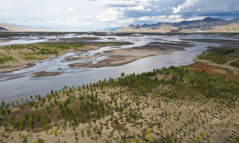 雅魯藏布江沿線日喀則市境內(nèi)河岸兩旁綠意盎然(2020年9月4日攝,無人機照片)。新華社發(fā)(索朗羅布 攝)