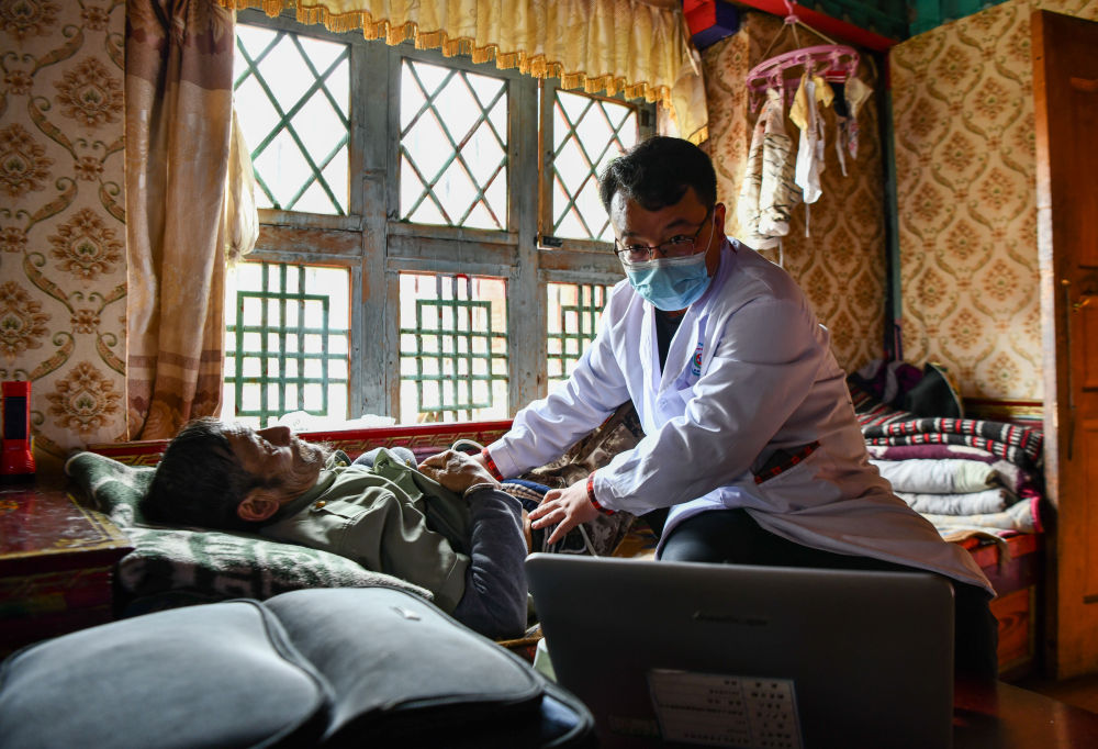 廣東珠海市人民醫(yī)院第七批援藏醫(yī)療隊王旭彤醫(yī)生在給西藏米林市吞不絨村患者珠杰檢查身體(2023年6月12日攝)。新華社記者 晉美多吉 攝