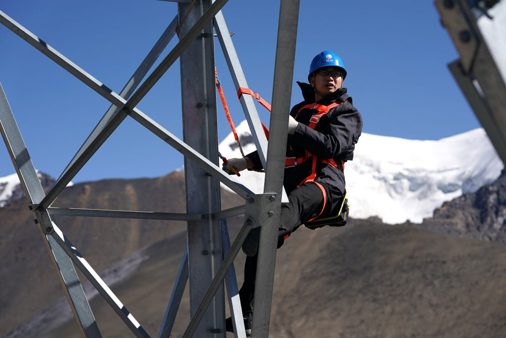 在西藏山南市洛扎縣,國家電網(wǎng)安徽省電力有限公司援藏工作人員徐四勤在浪洛線197號鐵塔進行線路巡視(2020年11月4日攝)。新華社記者 詹彥 攝