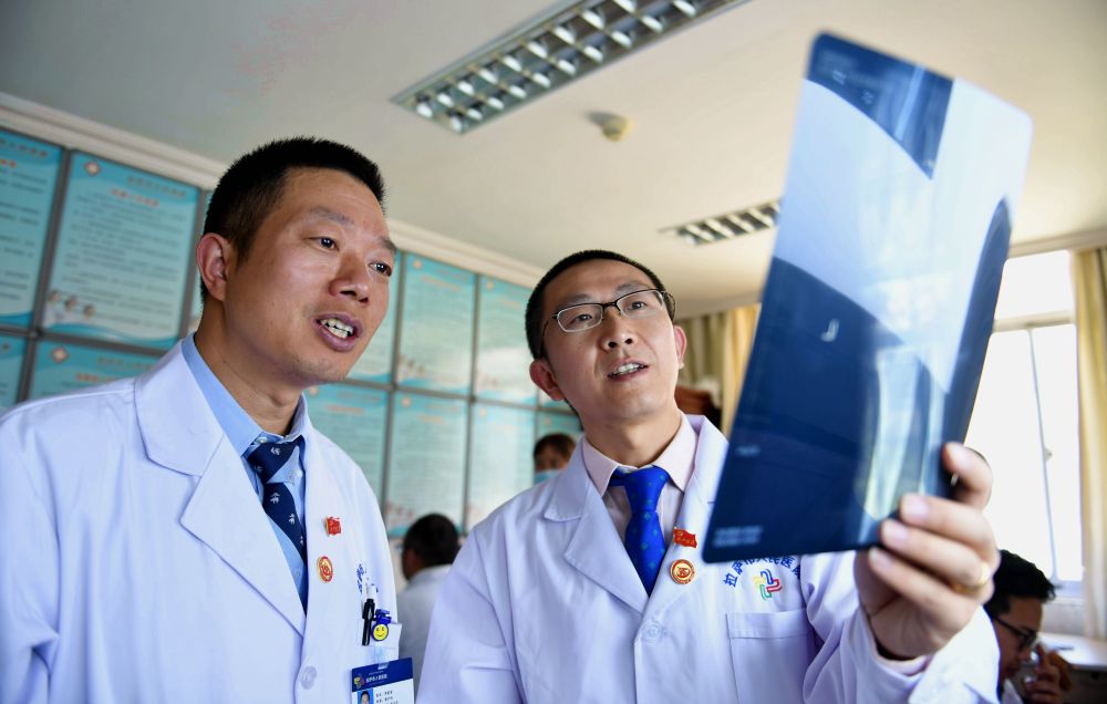 在拉薩市人民醫(yī)院骨科病房,北京積水潭醫(yī)院的援藏醫(yī)生龔曉峰(右)和北京天壇醫(yī)院援藏醫(yī)生李家謀查看患者的X光片(2017年8月3日攝)。新華社記者 晉美多吉 攝