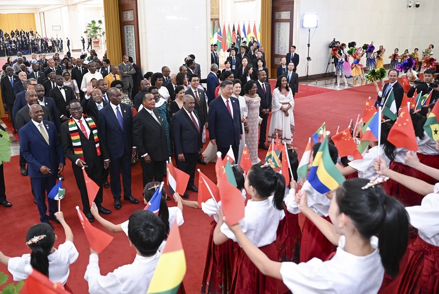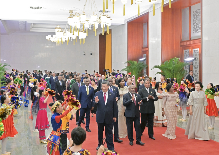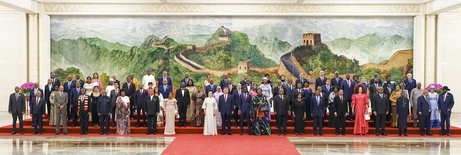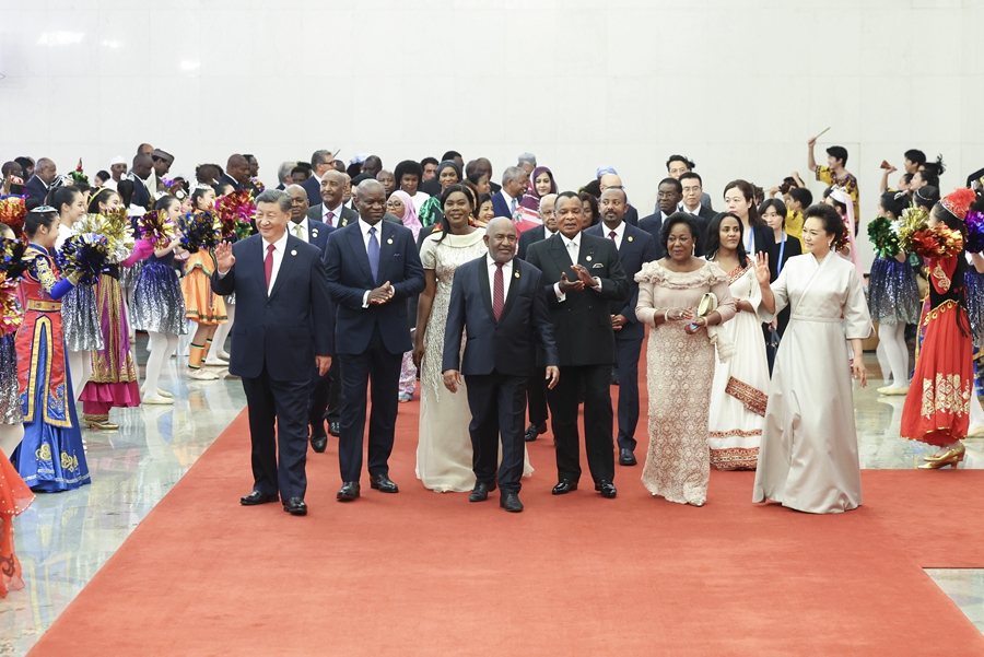 出席論壇峰會的51個非洲國家元首、政府首腦及配偶,2位總統代表,非盟委員會主席和聯合國秘書長等貴賓陸續抵達人民大會堂。習近平和彭麗媛熱情迎接,同他們分別握手問候,并集體合影留念。
