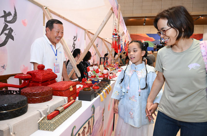 2024年8月7日,人們在中國工藝美術館(中國非物質文化遺產館)舉辦的非遺市集上參觀。新華社記者 李賀 攝