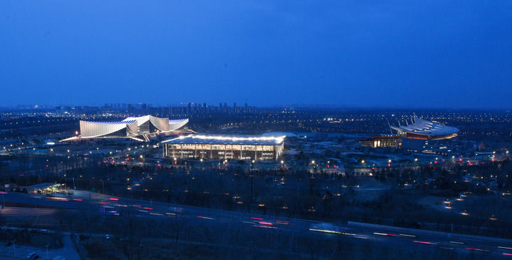 北京藝術中心、北京城市圖書館和北京大運河博物館夜景(從左至右,2024年2月28日攝)。新華社記者 鞠煥宗 攝