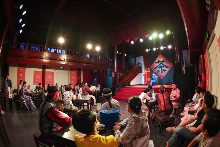 2024年7月7日,在北京市東城區顏料會館,觀眾在欣賞由北京市曲劇團演員帶來的沉浸式北京曲劇《茶館》。新華社記者 鞠煥宗 攝