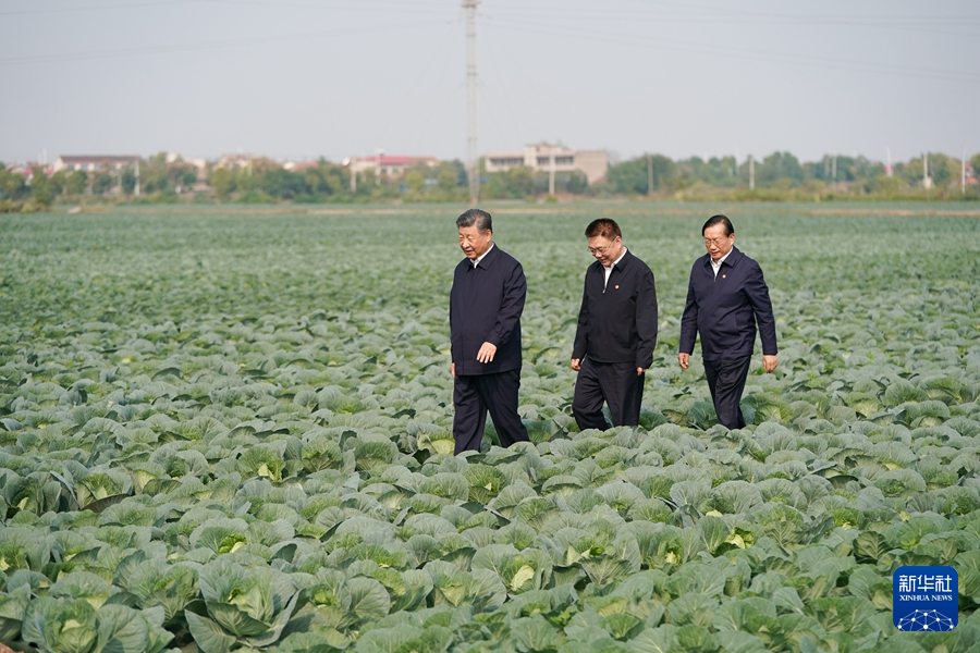 11月4日至6日,中共中央總書記、國家主席、中央軍委主席習近平在湖北考察。這是5日上午,習近平在咸寧市嘉魚縣潘家灣鎮十里蔬菜長廊考察時,走進田間,察看蔬菜長勢。