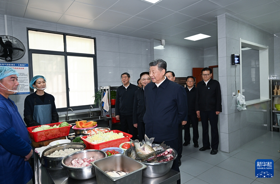 11月4日至6日,中共中央總書記、國家主席、中央軍委主席習近平在湖北考察。這是5日上午,習近平在咸寧市嘉魚縣潘家灣鎮四邑村養老服務驛站食堂考察。