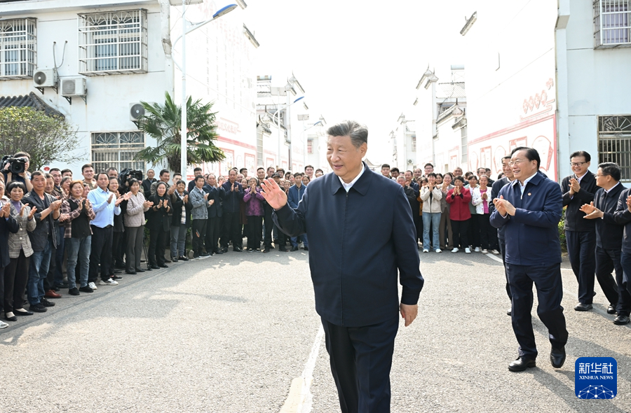 11月4日至6日,中共中央總書記、國家主席、中央軍委主席習近平在湖北考察。這是5日上午,習近平在咸寧市嘉魚縣潘家灣鎮四邑村考察時,向村民們揮手致意。