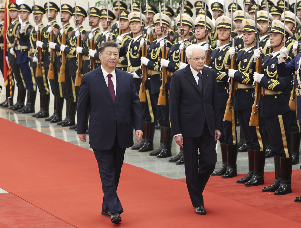 天安門廣場鳴放21響禮炮,禮兵列隊致敬。兩國元首登上檢閱臺,軍樂團奏中意兩國國歌。馬塔雷拉在習(xí)近平陪同下檢閱中國人民解放軍儀仗隊,并觀看分列式。