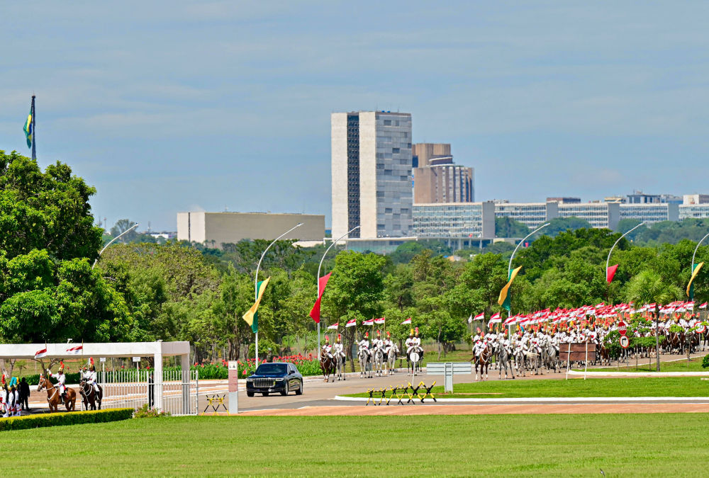 初夏時節(jié)的巴西利亞,天朗氣清。黎明宮內(nèi),綠草如茵,450名威武禮兵整齊列隊。在120名龍騎兵護衛(wèi)下,習近平乘車抵達黎明宮前廣場。