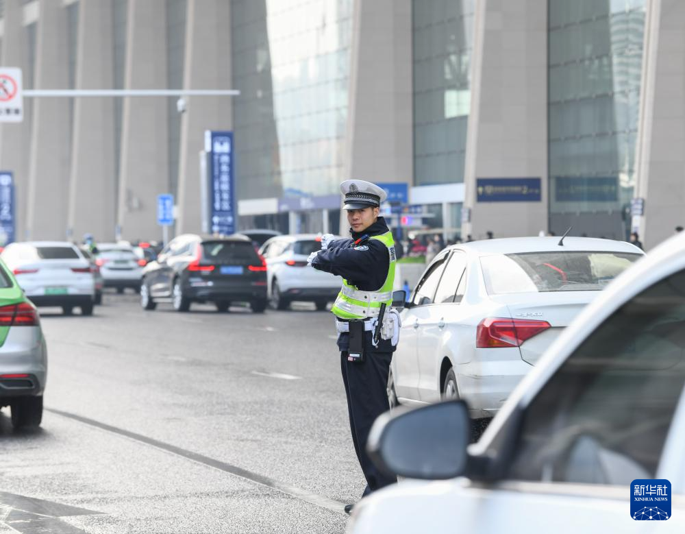 1月14日,在成都東站北落客平臺,成都鐵路公安處交通警察支隊民警熊杰在指揮交通。