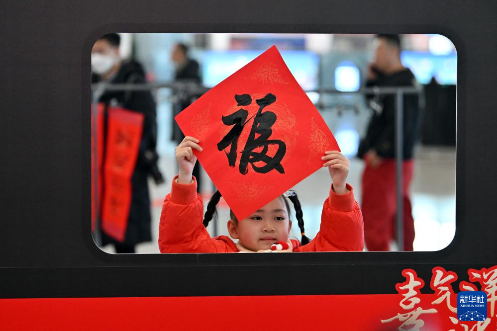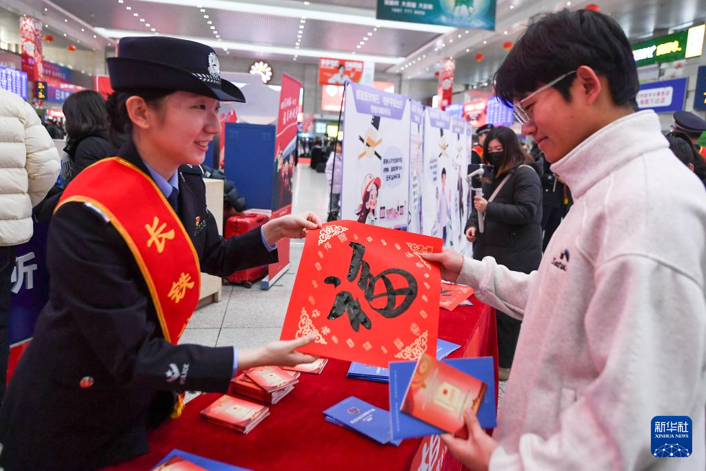 1月14日,在長春站候車大廳,長春鐵路公安處民警為旅客送福字。