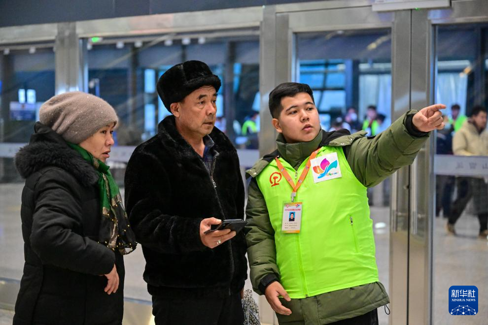 1月14日,在新疆烏魯木齊站候車大廳,志愿者為乘客指路。