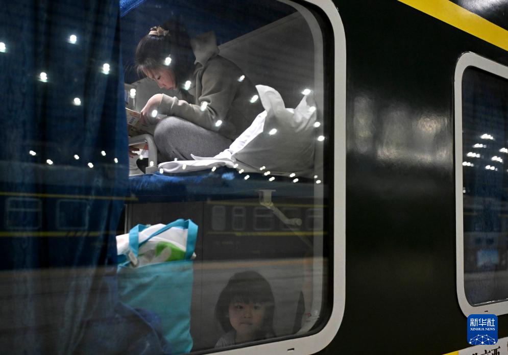 在1月14日0時02分發車的北京地區春運首趟旅客列車K4159次的車廂中,一位小乘客在閱讀(1月13日攝)。