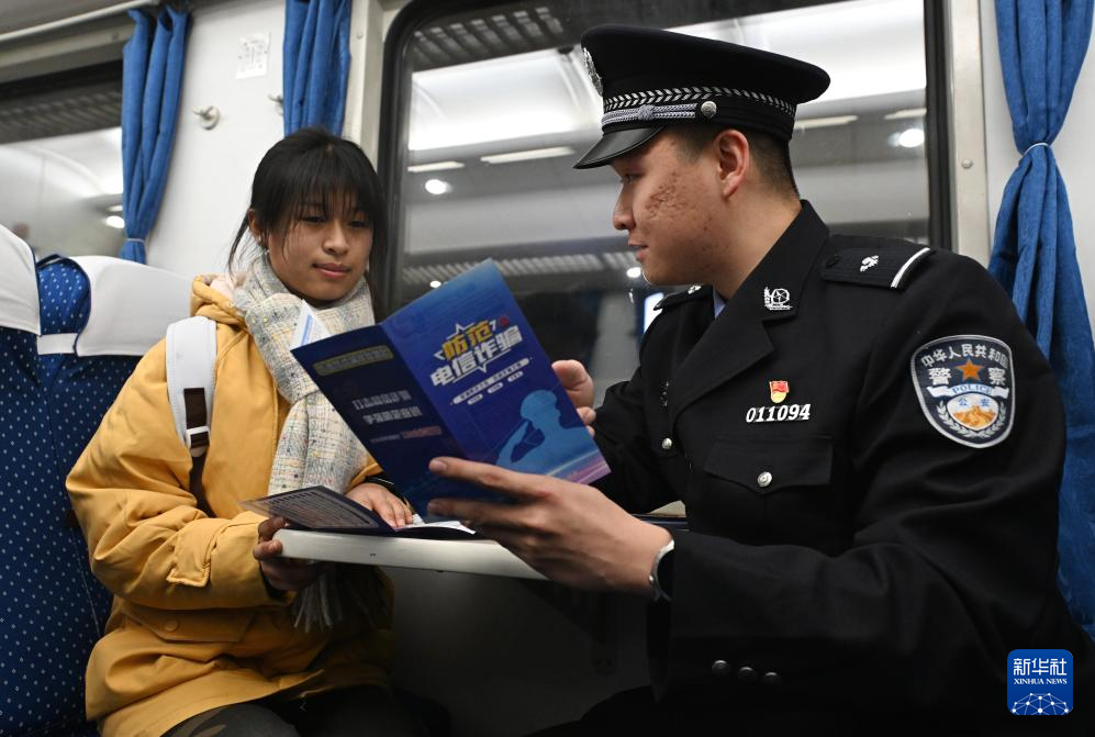 北京鐵路公安處乘警支隊宣傳小隊的警官王海洋在北京西至合肥的K4159次列車上為乘客講解如何防范電信詐騙(1月13日攝)。這趟列車于1月14日0時02分發車,是北京地區開出的2025年春運首趟旅客列車。
