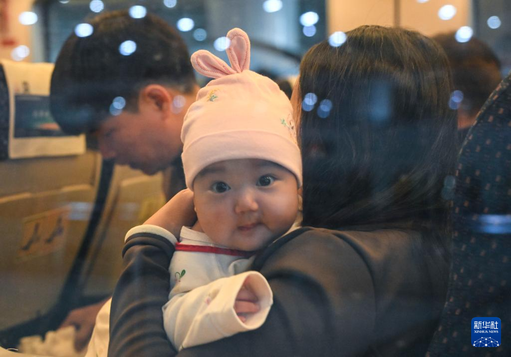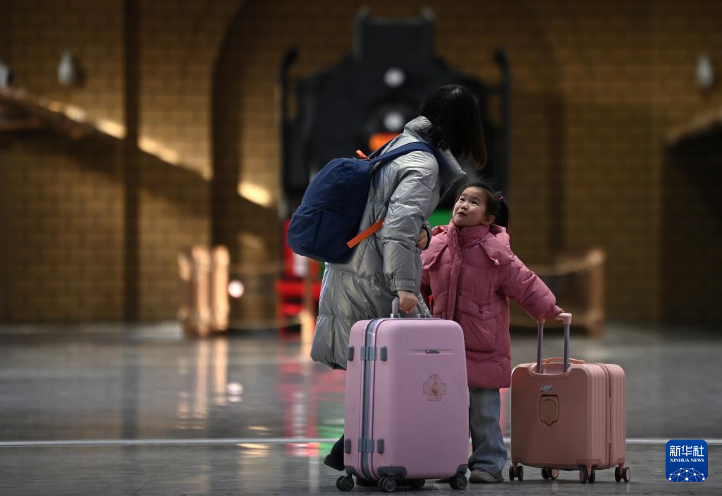 在北京西站,一位小朋友(前中)跟隨家人,準備乘坐北京西至合肥的K4159次列車(1月13日攝)。這趟列車于1月14日0時02分發車,是北京地區開出的2025年春運首趟旅客列車。