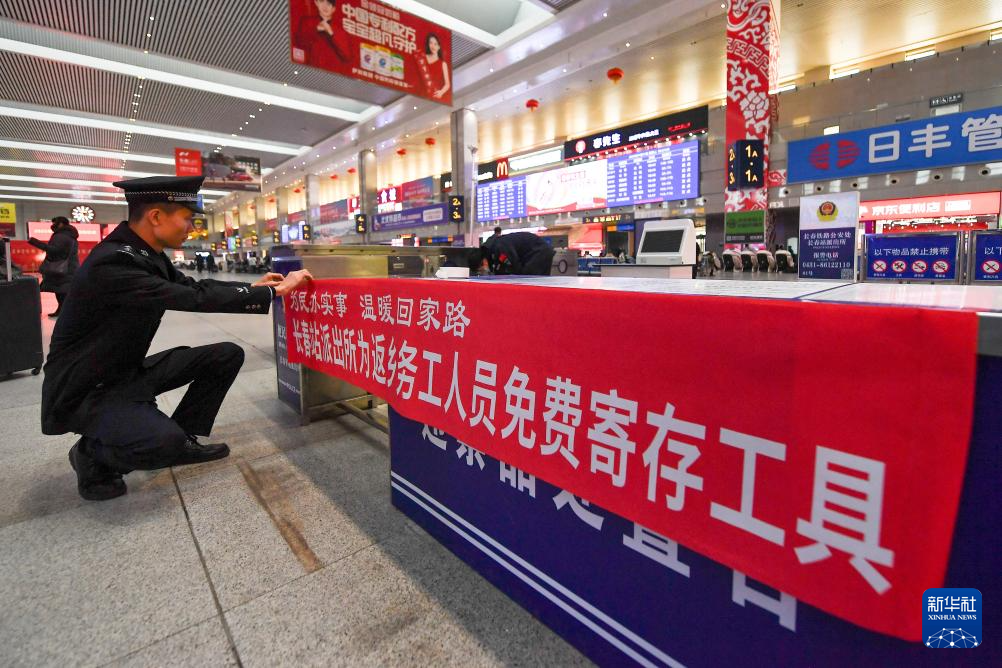 1月14日,在長春站候車大廳,長春鐵路公安處民警設置服務臺,為旅客寄存無法帶走的工具。