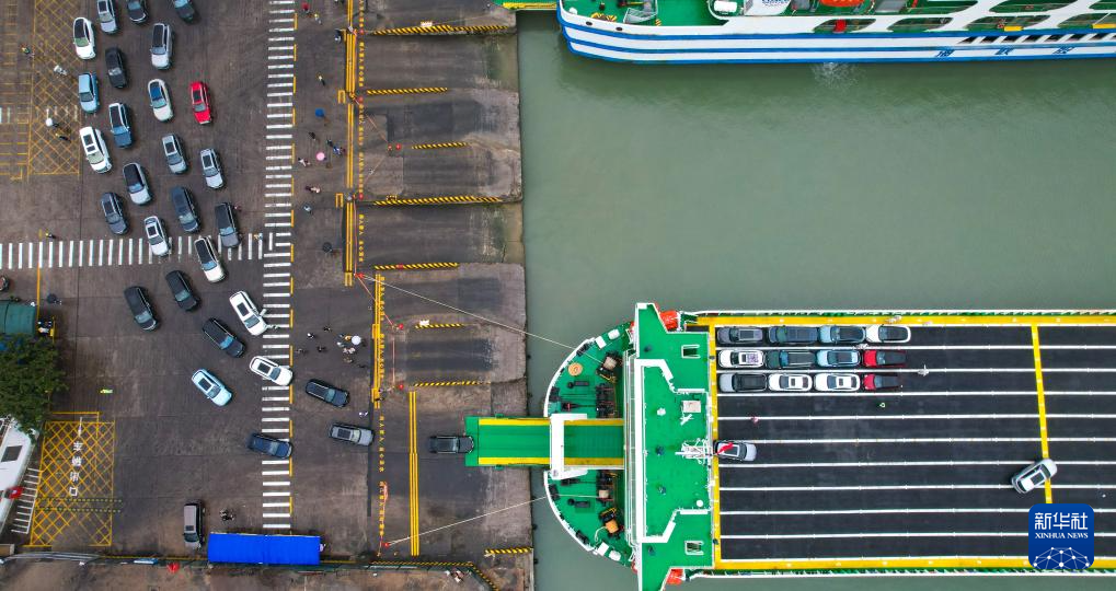 1月14日,在海南省海口市秀英港,車輛有序駛離客滾船(無人機照片)。