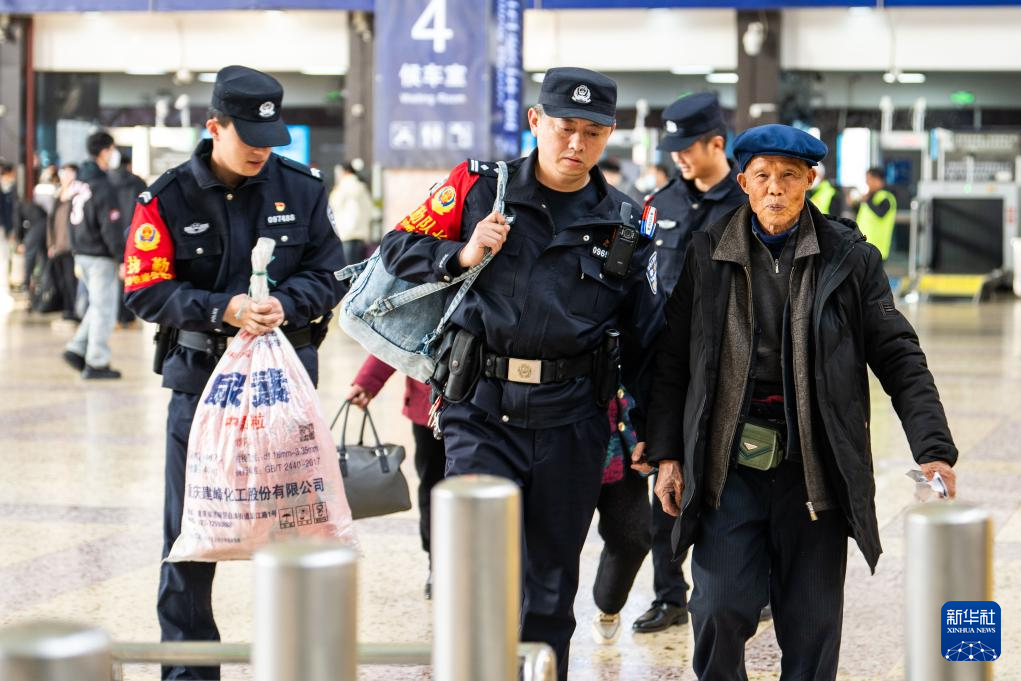 1月14日,在長沙火車站,鐵路民警幫助旅客搬運行李。