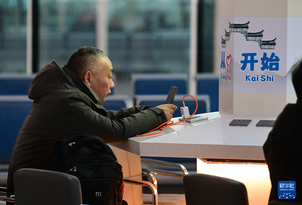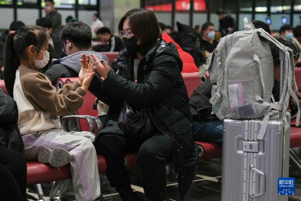在北京西站,9歲的小果(左一)在候車室內與媽媽玩游戲,等候乘坐K4159次列車返回安徽阜陽老家過年(1月13日攝)。這趟列車于1月14日0時02分發車,是北京地區開出的2025年春運首趟旅客列車。