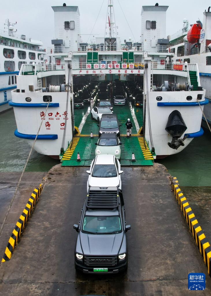 1月14日,在海南省海口市秀英港,新能源車排隊駛入新能源車專用運輸船“綠源二號”(無人機照片)。