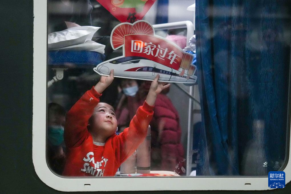 在北京地區春運首趟旅客列車K4159次發車前,一位小乘客拿著“回家過年”的標牌在車廂內玩耍(1月13日攝)。這趟北京西至合肥列車于1月14日0時02分發車。