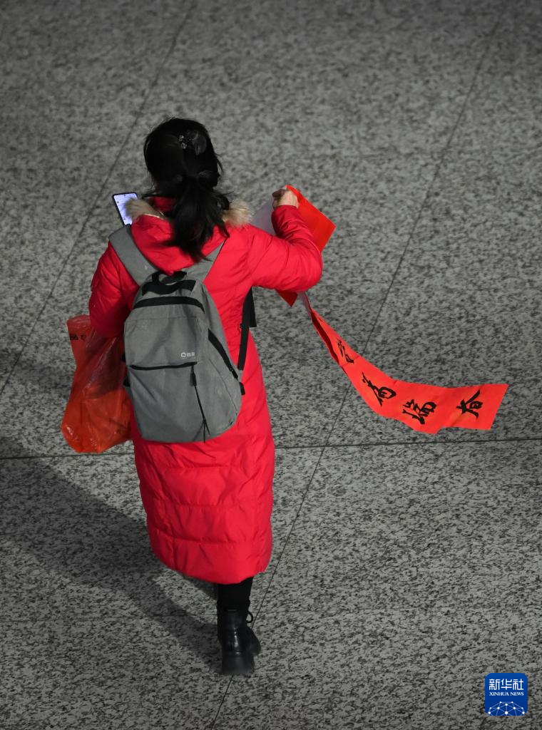 1月14日,在西安站候車大廳,一名旅客手持春聯進站候車。