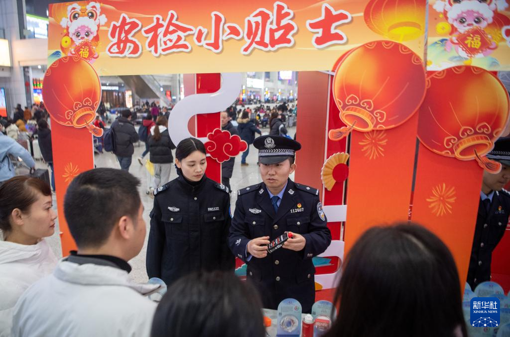1月14日,在重慶北站,重慶鐵路警察在向候車乘客普及乘車安全知識。