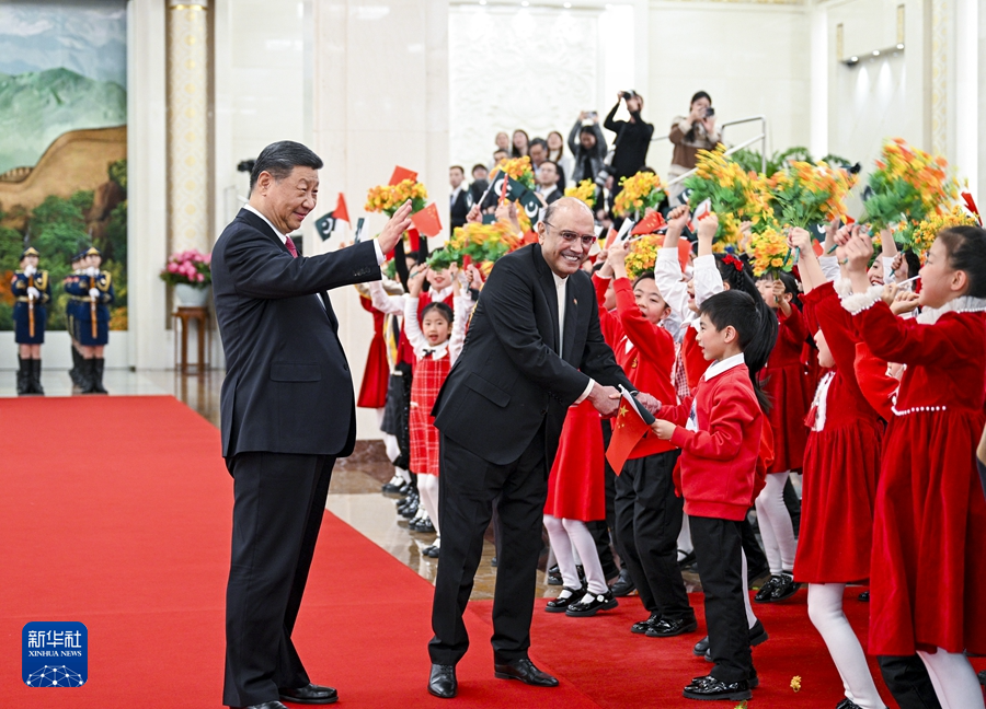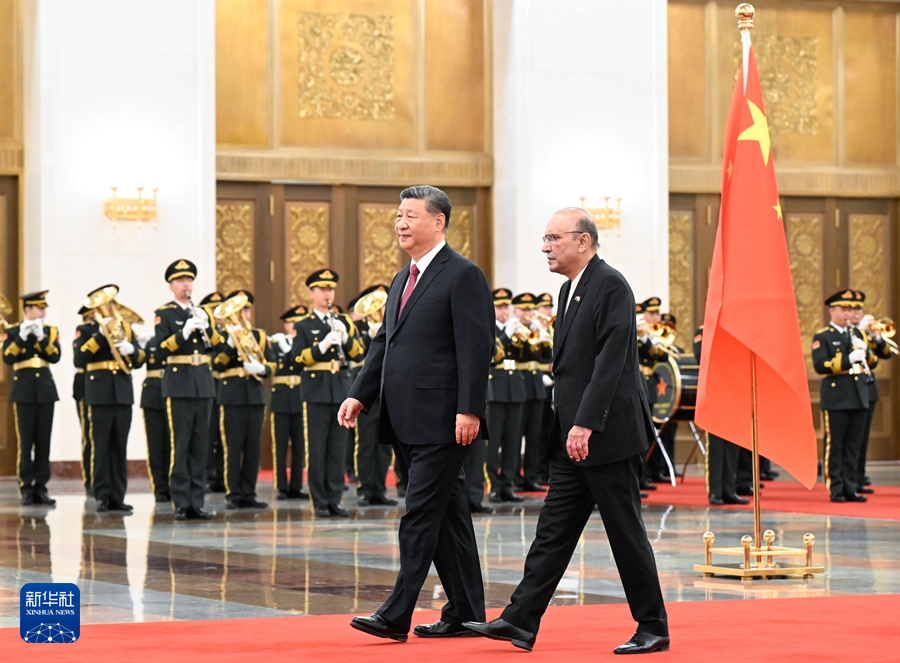 ??2月5日下午,國家主席習近平在北京人民大會堂同來華進行國事訪問的巴基斯坦總統扎爾達里舉行會談。這是會談前,習近平在人民大會堂北大廳為扎爾達里舉行歡迎儀式。