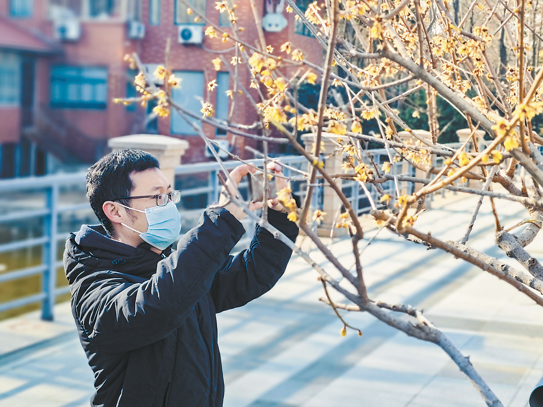 2月9日,市區天香公園的蠟梅競相綻放,飄散陣陣幽香,吸引眾多游客前來觀賞拍照。