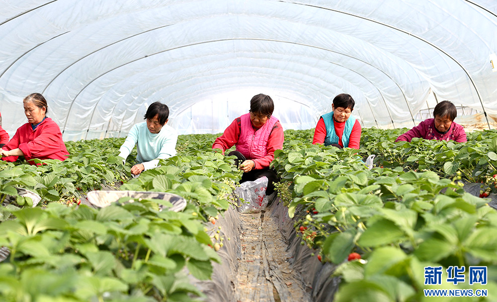 村民在大棚里采摘草莓。新華網(wǎng)發(fā)