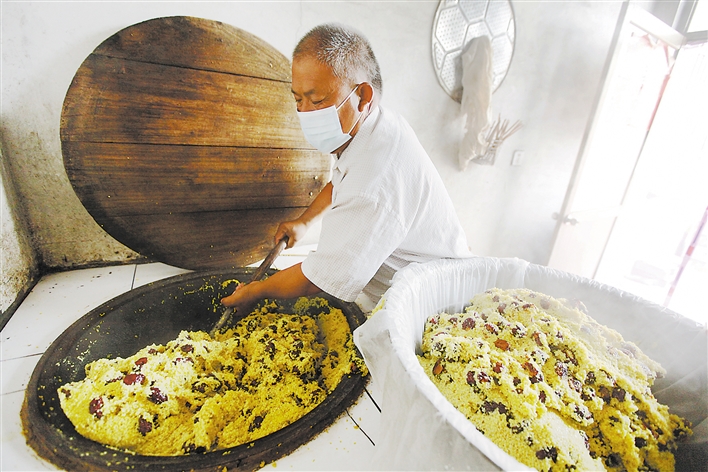 現在的黃米粽仍采用祖輩的傳統做法,各道工序靠手工。程元啟在繼承的基礎上,也有自己的一些研究,想要米粽口感好味道好,需采用東北大黃米、新疆大棗,用傳統燒柴地鍋,要不惜力氣下功夫,冬天冷夏天熱,沒有耐心是做不出一鍋好黃米粽的。