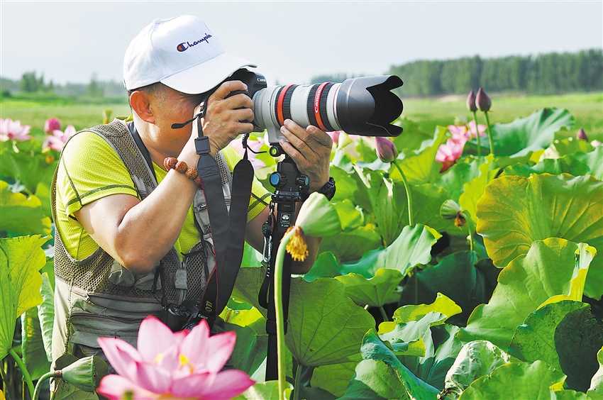 在精品區的池塘邊,不少攝影愛好者也趕來拍攝荷花?!懊磕晡叶紩恚郧昂苫ǚN植零零散散,荒草比較多,現在規劃了棧橋,規整了荷塘,新增了荷花品種,整個濕地公園的湖面上都是,蔚為壯觀,從實景中就能得到拍攝靈感?!辈稍L中,攝影愛好者張宏偉說道。