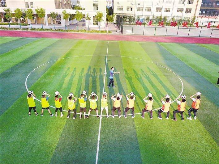 國家足球二級裁判員、二十一中長江路校區(qū)足球教練李存剛正在訓(xùn)練學(xué)生們踢足球。