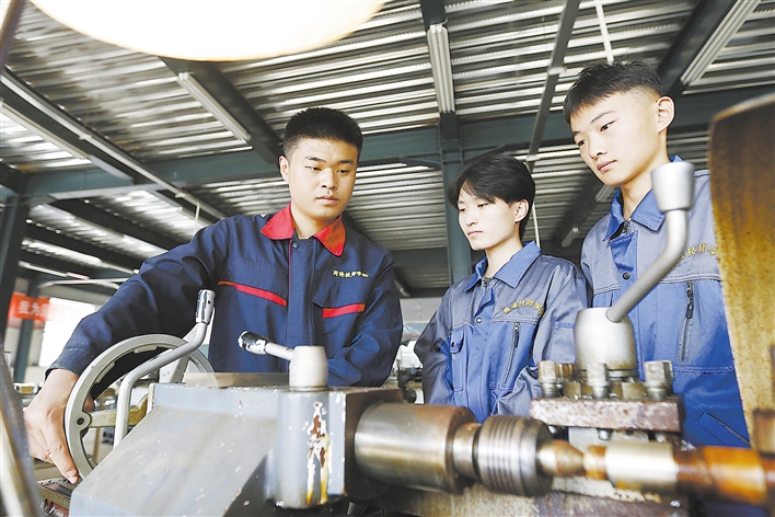 圖為劉忠?guī)浾谥笇?dǎo)學(xué)生進行普通車床零件加工。