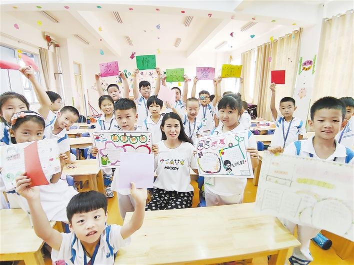 工作中,美術(shù)老師龐敏正在和小朋友們一起歡度教師節(jié)。