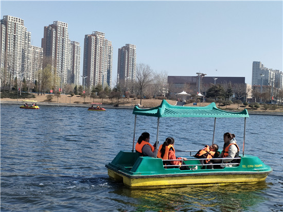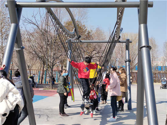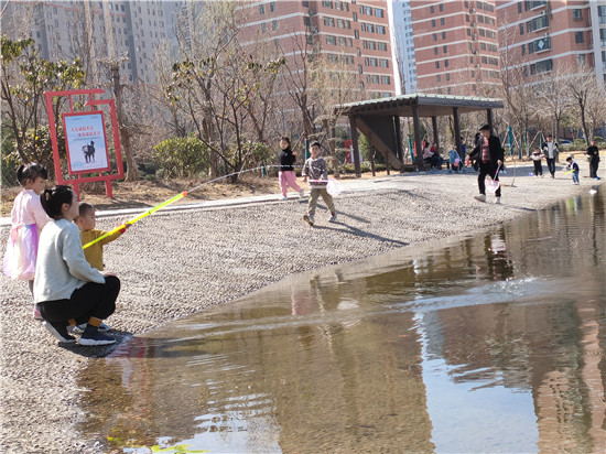 2月21日,趙王河公園游人如織,盡管臨近中午但市民不愿離開,附近的兒童公園成為孩子們玩耍、嬉戲的樂園。勇敢攀爬、快樂滑梯、沙池中嬉戲、蕩秋千……這些項目吸引了眾多孩子,公園里處處歡聲笑語。溫度較高,很多孩子在家人的看護下走到河邊戲水,有的市民帶領孩子水中泛舟。