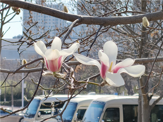 趙王河畔,抽出新葉的柳條在陽光照射下隨風搖擺。牡丹廣場上,盛開的玉蘭花吸引游人駐足欣賞、拍照。