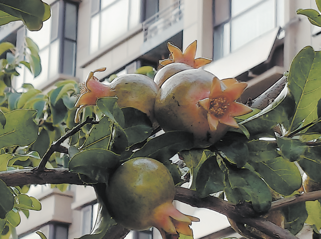 小區(qū)石榴樹(shù)結(jié)出多枚并蒂果