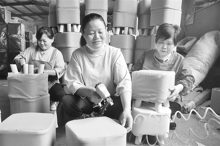 5月21日,定陶區濱河街道辦事處崔莊扶貧車間內,貧困戶劉訓粉(中)等工人正在加工小板凳。2016年以來,濱河街道共建設扶貧車間10個,建筑面積6300平方米。崔莊扶貧車間率先引進皮凳加工項目,并利用互聯網進行線上銷售。目前,已帶動馬紀莊、王店、后楊樓等四個扶貧車間運營皮凳項目,共安排20余名貧困戶及其子女就業務工,月收入2000余元。既增加了村集體收入,又有效發揮了產業扶貧和就業扶貧的示范帶動作用。