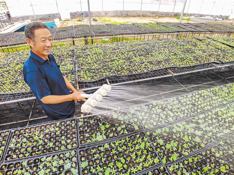 5月22日,定陶區(qū)馬集鎮(zhèn)梁堂社區(qū)多肉種植大棚內(nèi),種植戶正在澆水和施肥作業(yè)。梁堂社區(qū)以土地增減掛鉤政策為突破口,實施整村搬遷,建設(shè)新型農(nóng)村社區(qū),通過土地流轉(zhuǎn)大力發(fā)展現(xiàn)代農(nóng)業(yè),引進(jìn)鑫盛種植專業(yè)合作社,發(fā)展多肉種植產(chǎn)業(yè),建成多肉種植大棚29座,年產(chǎn)值300余萬元,年可吸納100余人就業(yè)。 記者 李保珠 攝
