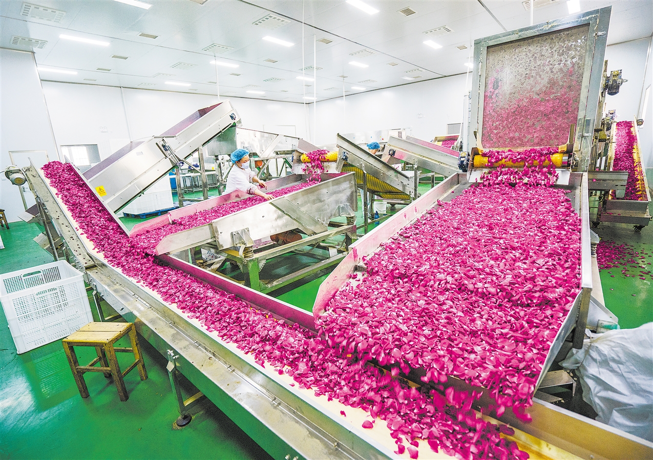 圖① 黃店鎮(zhèn)整合扶貧資金570萬元,引進(jìn)全自動(dòng)無菌化生產(chǎn)線,在何莊社區(qū)設(shè)立扶貧車間,車間承包人每年上交30萬元扶貧項(xiàng)目分紅資金,年收購加工2000多戶村民的玫瑰花。該鎮(zhèn)利用17個(gè)扶貧項(xiàng)目和25個(gè)扶貧車間,帶動(dòng)貧困戶家門口就業(yè),穩(wěn)定增收。
